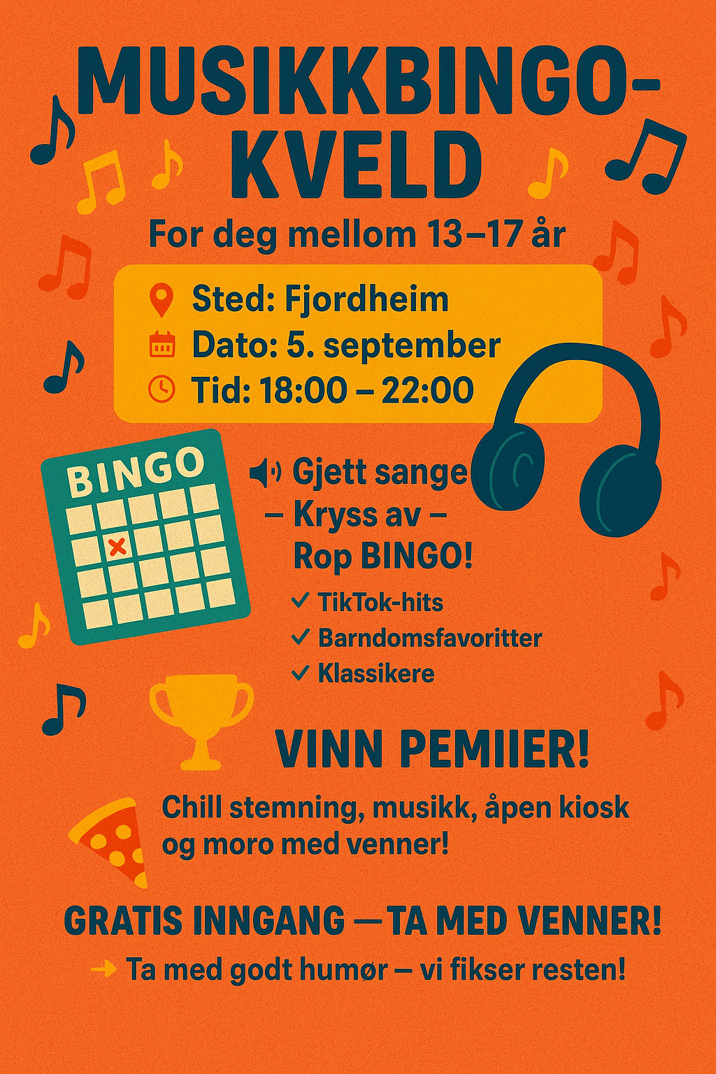 Ungdomskveld på Fjordheim med musikkbingo, fine premier og masse morro! 😃